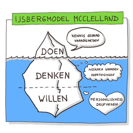 👉 Kortom: de ijsberg van McClelland maakt duidelijk dat zichtbaar gedrag (kennis en vaardigheden) maar een klein deel is van wie iemand is; de diepere, onzichtbare lagen zijn vaak bepalender voor iemands prestaties.